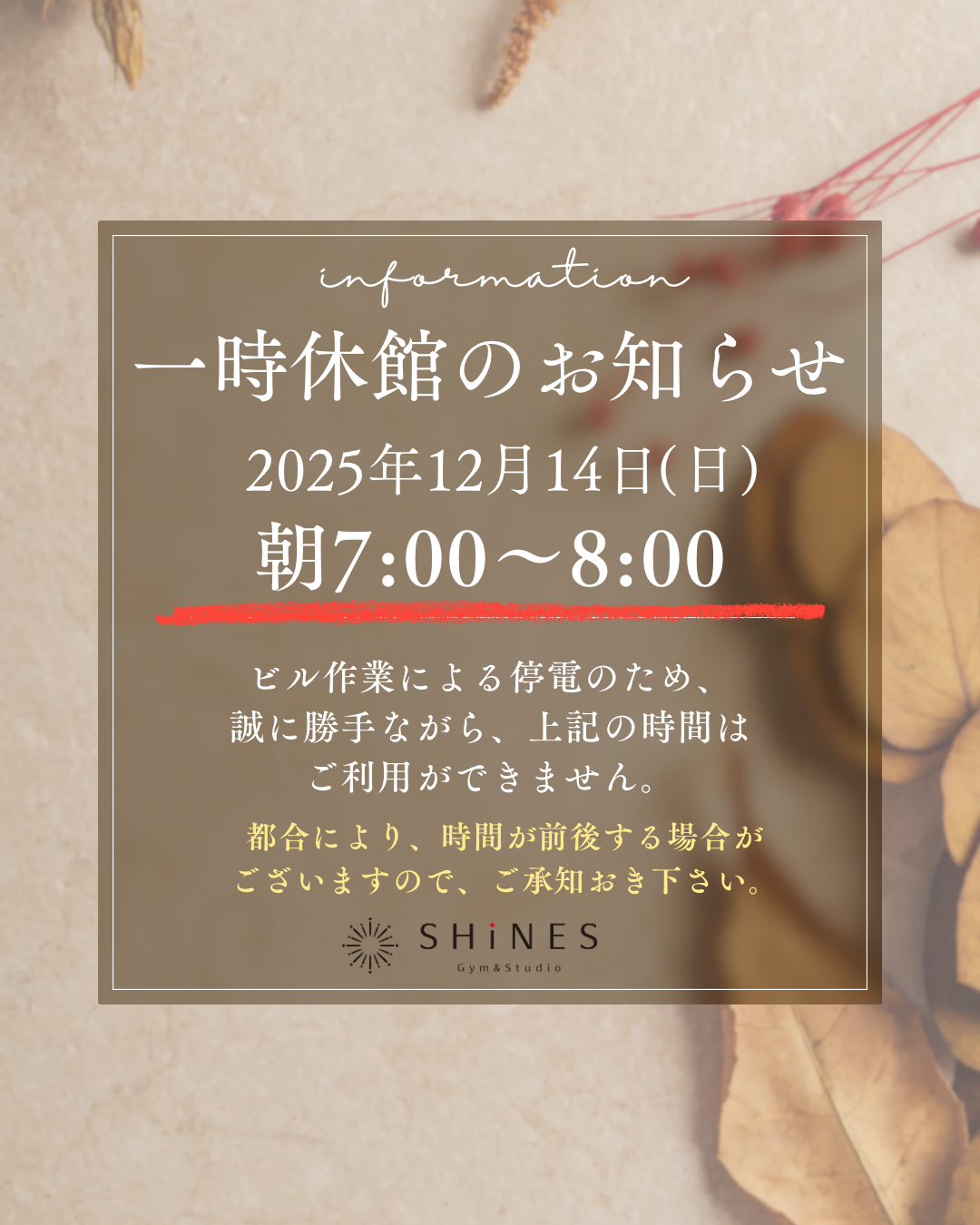 誠に勝手ながら、上記の時間帯はビル作業による停電のため、ご利用ができません。都合により、時間が前後する場合がございますので、ご承知おき下さい。どうぞ宜しくお願いいたします。