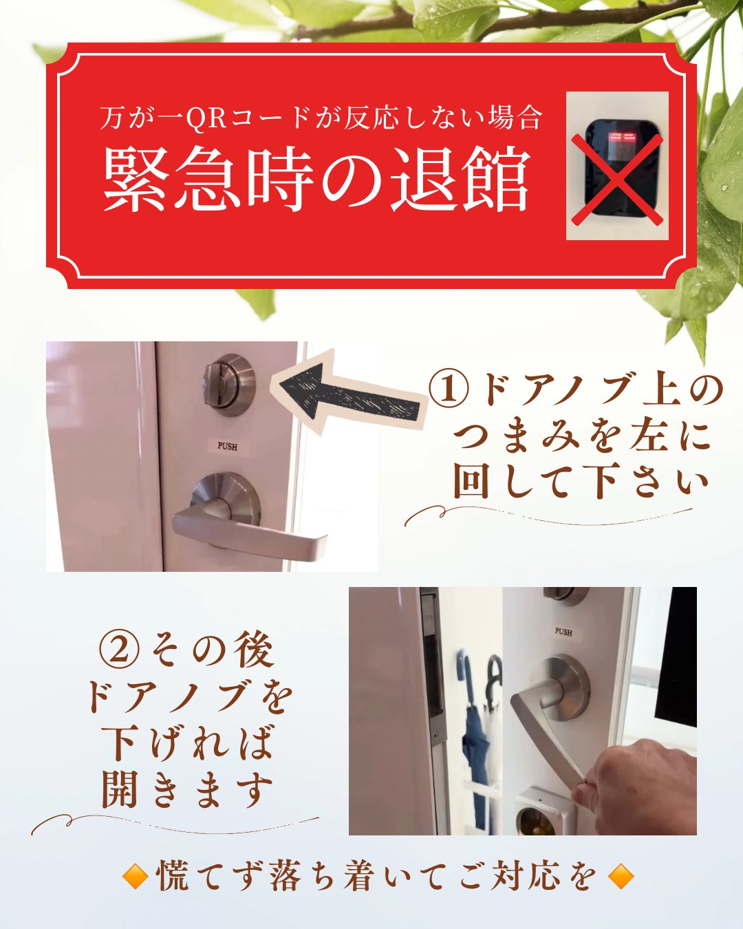 ①退出➡️QRコードをかざす時間がない場合や反応しない場合は、サムターン(つまみ)を左に回し、レバーハンドルを下げ退出するようお願いいたします。(添付写真参照)